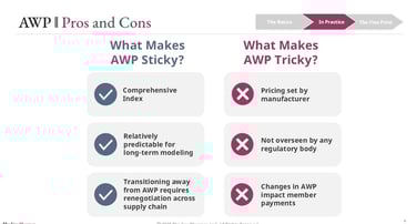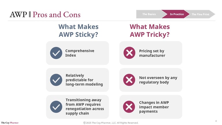 AWP is both sticky and tricky. Its stability over time offers a reliable long-term model even as it increases predictably. However, transitioning away from AWP requires renegotiation across the supply chain, as PBMs balance minimizing risks while transitioning to potentially more favorable grounding beyond AWP.