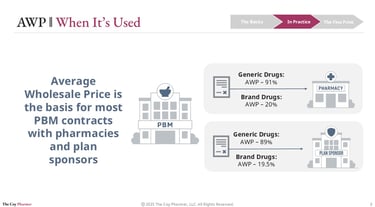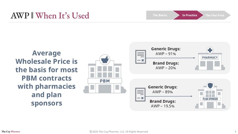 AWP influences numerous decisions in the pharmacy benefits landscape. Most contracts between Pharmacy Benefit Managers (PBMs), pharmacies, and plan sponsors are based on AWP. For pharmacies, PBMs might negotiate scenarios such as reimbursing generic drugs at AWP minus 91% and brand drugs at AWP minus 20%. Contracts with plan sponsors may offer different discounts, allowing PBMs to maintain a margin.