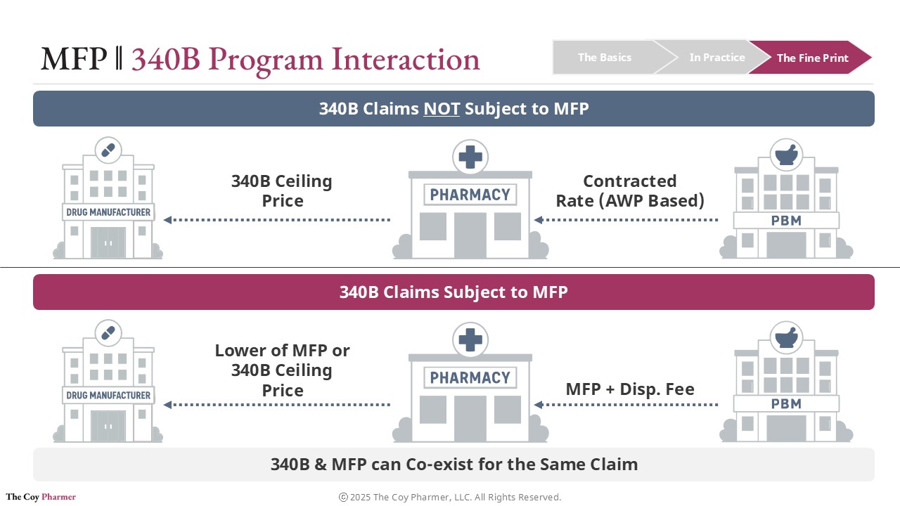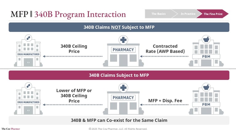 If the same drug is also subject to a Maximum Fair Price under Medicare, the acquisition side usually remains unchanged. Covered entities can still obtain the drug at the 340B ceiling price or the MFP if MFP is lower than the 340b ceiling price. The shift occurs on the reimbursement side, where Medicare payment for selected drugs is based on the negotiated Maximum Fair Price.
