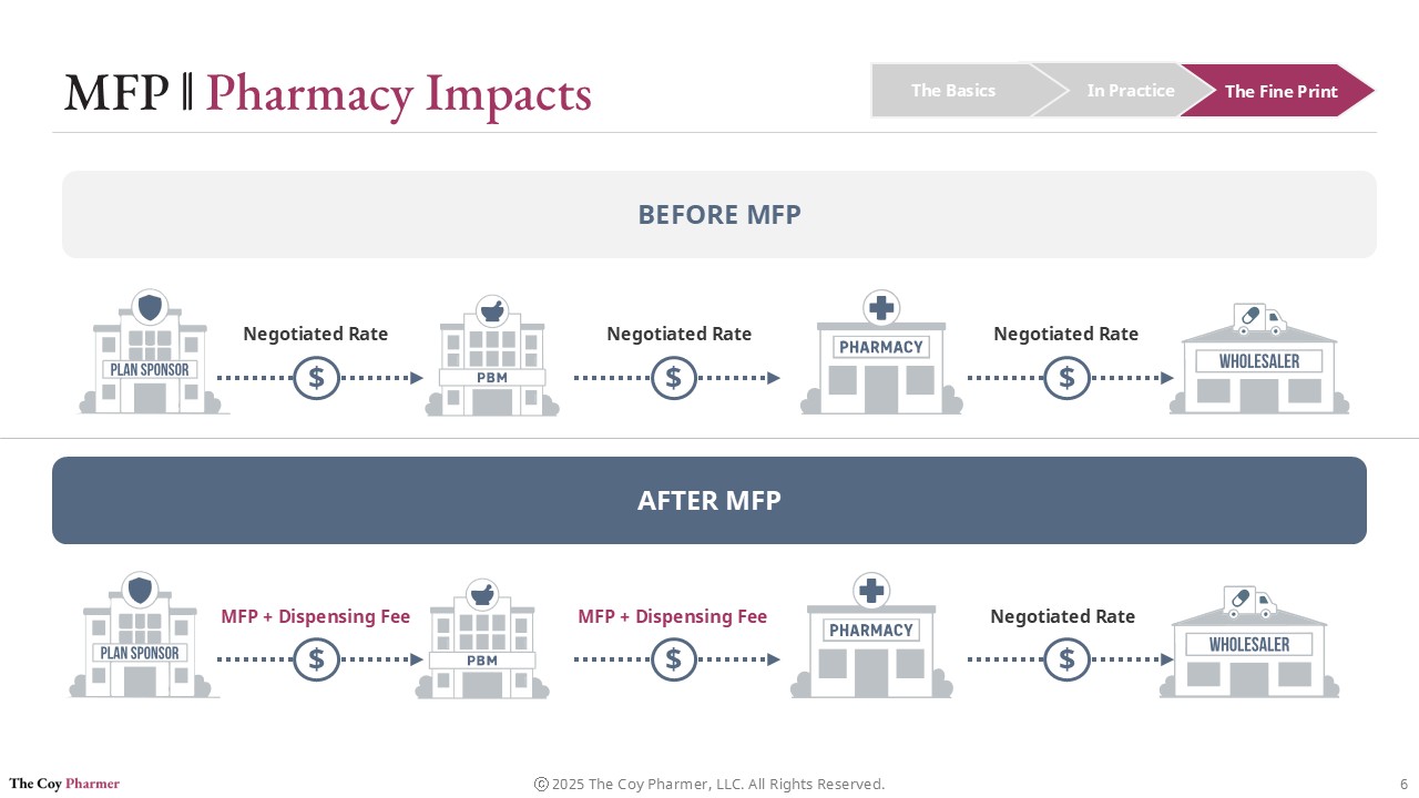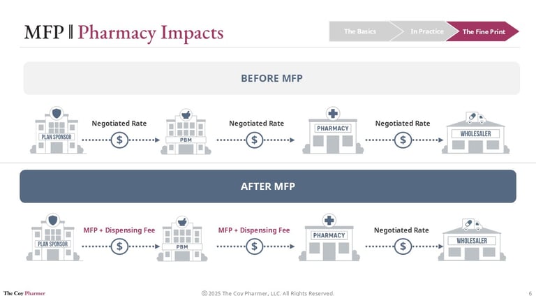 Pharmacies do not negotiate MFP directly. They must adapt to whatever reimbursement framework flows through plan sponsors and PBMs after the negotiated price is established. The MFP program does not necessarily improve the pharmacy’s ability to buy drugs, but may lower reimbursement rates.