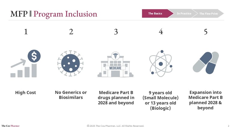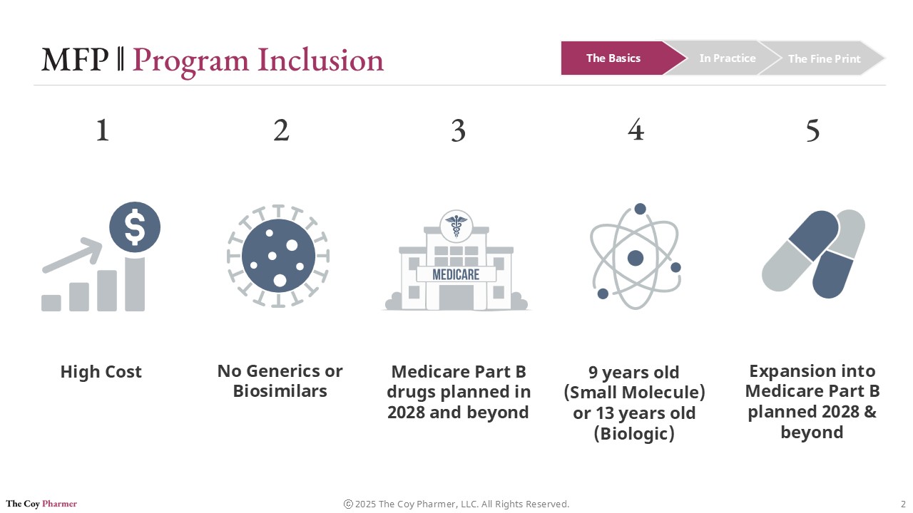 Not every drug qualifies for MFP. CMS selects medications based on statutory criteria designed to target products with the largest fiscal impact and limited market competition.