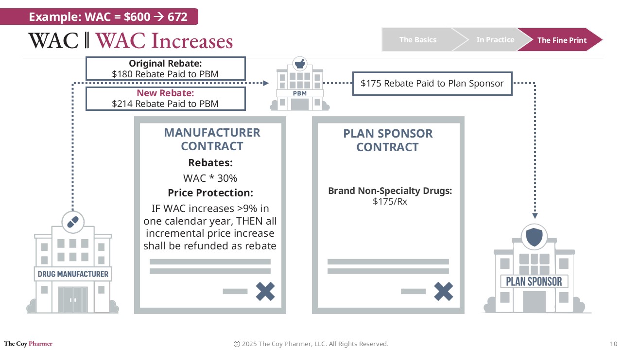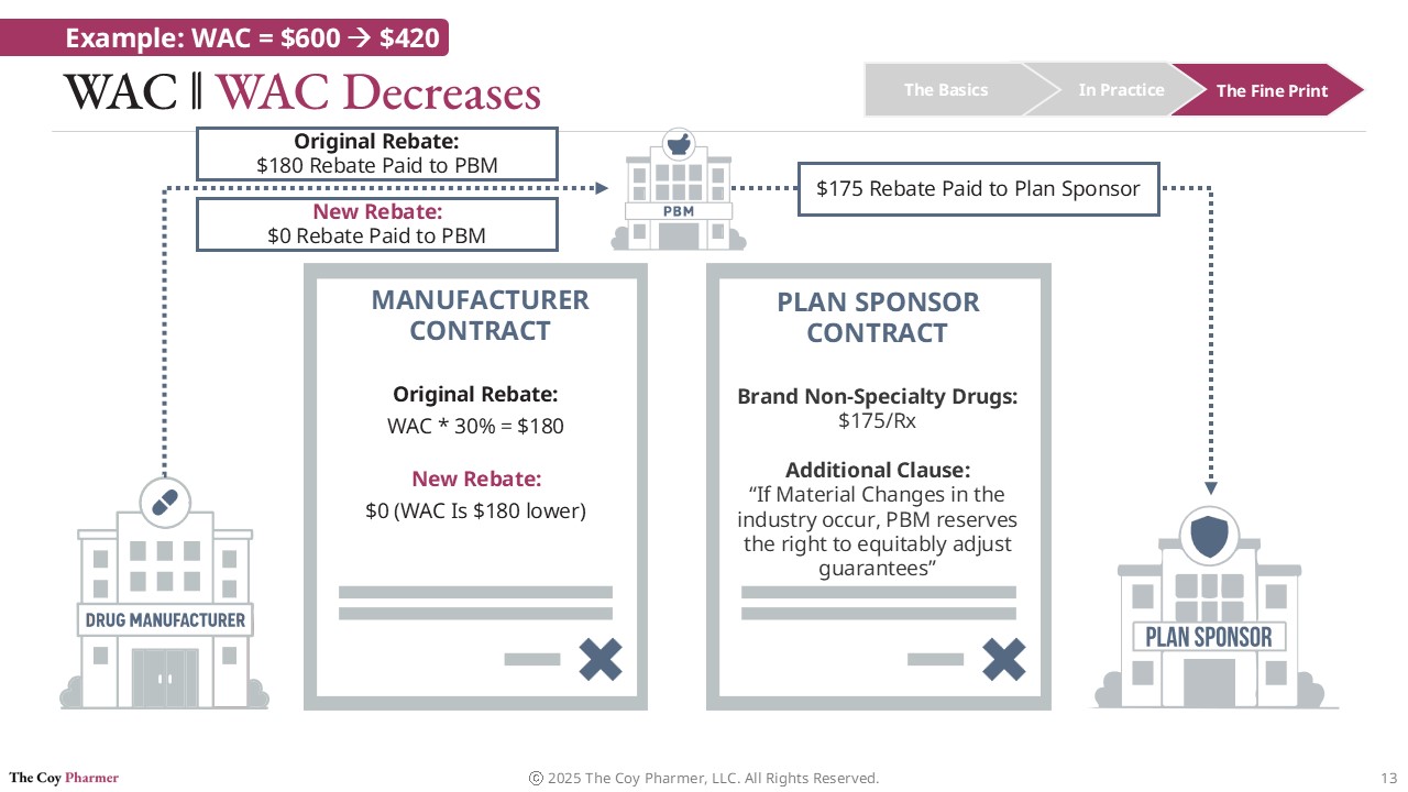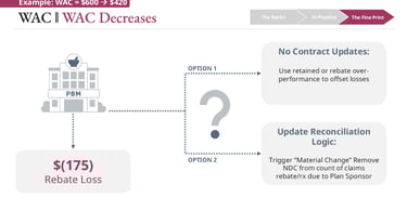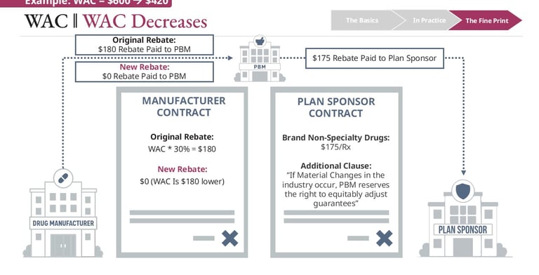 These changes can create operational and financial challenges for PBMs. When WAC drops and rebate structures are removed or reduced, PBMs may no longer be able to invoice the rebate amounts originally anticipated in their contracts with manufacturers. This disrupts expected financial flows that were built into pricing guarantees and modeling assumptions for rebate amounts due to plan sponsors.