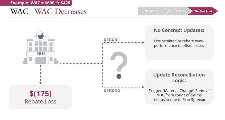 As a result, PBMs are often faced with difficult choices. They may absorb the lost revenue, which can pressure margins, or they may seek to update contract terms or reconciliation approaches with plan sponsors. Adjusting plan sponsor terms, however, can introduce friction, particularly if pricing guarantees, rebate expectations, or financial projections were built around the prior higher-WAC, high-rebate structure.