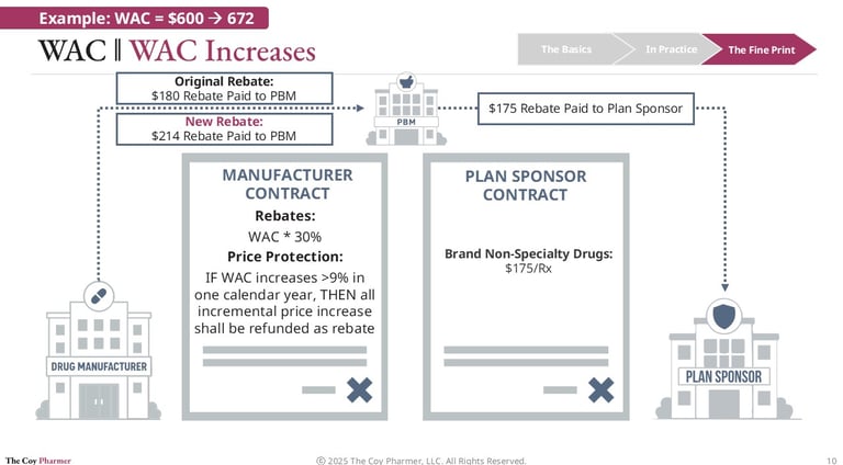 For example, if a drug’s WAC increases from 600 dollars to 672 dollars in a single year, the rebate amount payable to the PBM may also increase. This can occur in two ways. First, a WAC-based rebate formula automatically yields a higher dollar rebate when the underlying list price rises. Second, price protection provisions may be triggered. These provisions are designed to shield PBMs and plan sponsors from unexpected in-year WAC increases and can generate additional rebate liability for the manufacturer.